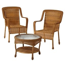 Set of 2 chairs and accent table; All-weather wicker construction; Powder-coated steel frames; Won't rust, fade or mildew; Tempered glass tabletop.