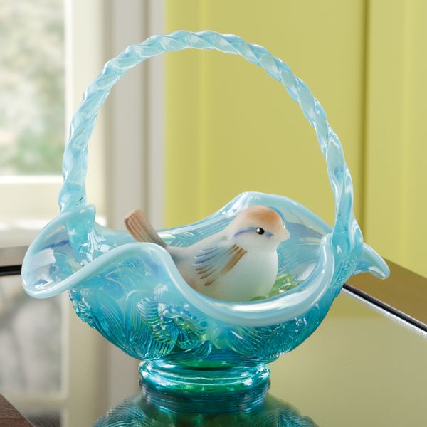 Fenton Robin's Egg Blue Basket with Bird: Created by master glassmakers of Fenton exclusively for Lenox. Display hand-painted art glass Opal bird next to Robin's Egg Blue glass basket, or inside on a nest of glass marbles.